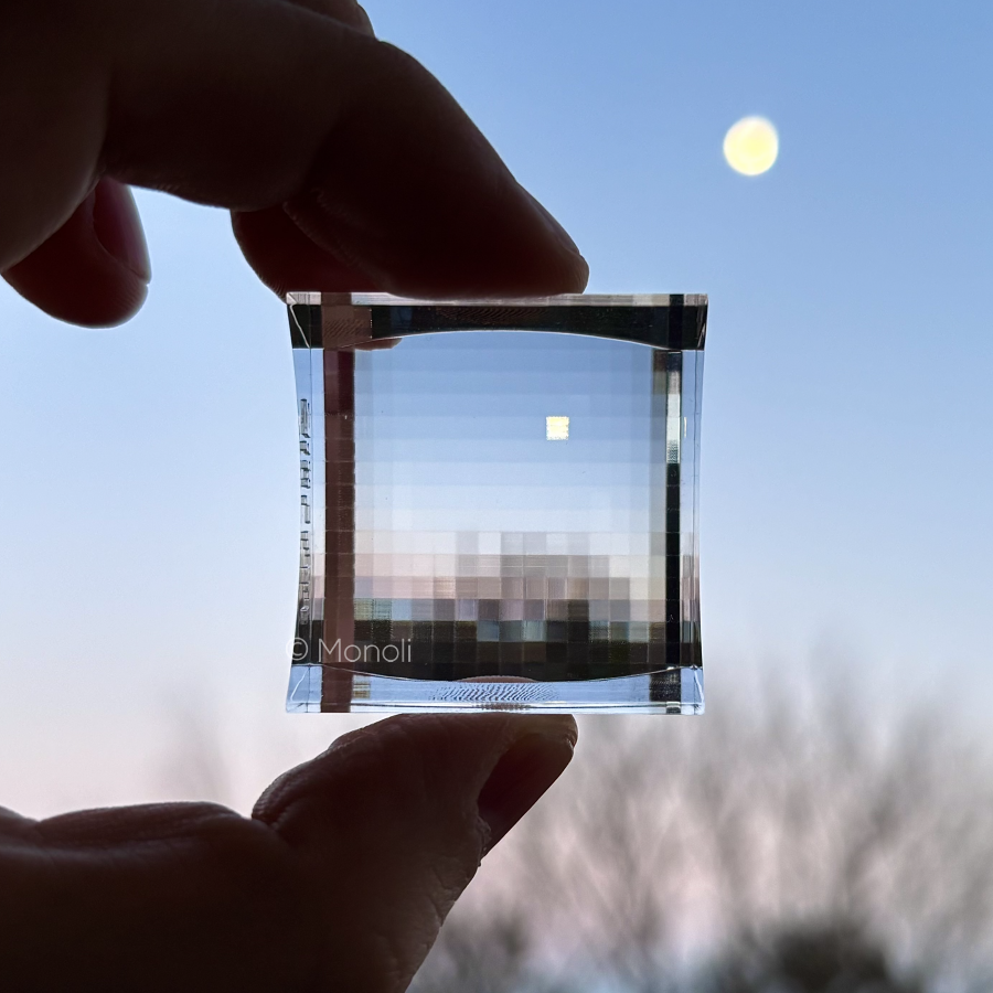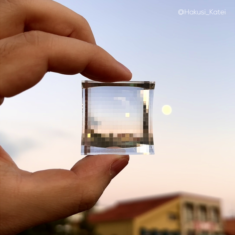 数多くの素材にて行ったテストを踏まえて、ピクセル化のしやすさ、キズの付きにくさ、落下時や集光のリスク等を考慮し、あえてアクリルを選択しました。表面の構造をコントロールするため、単純な金型等による量産ではなく、最新の加工手法や手作業を組み合わせて1つ1つ丁寧に製作しています。